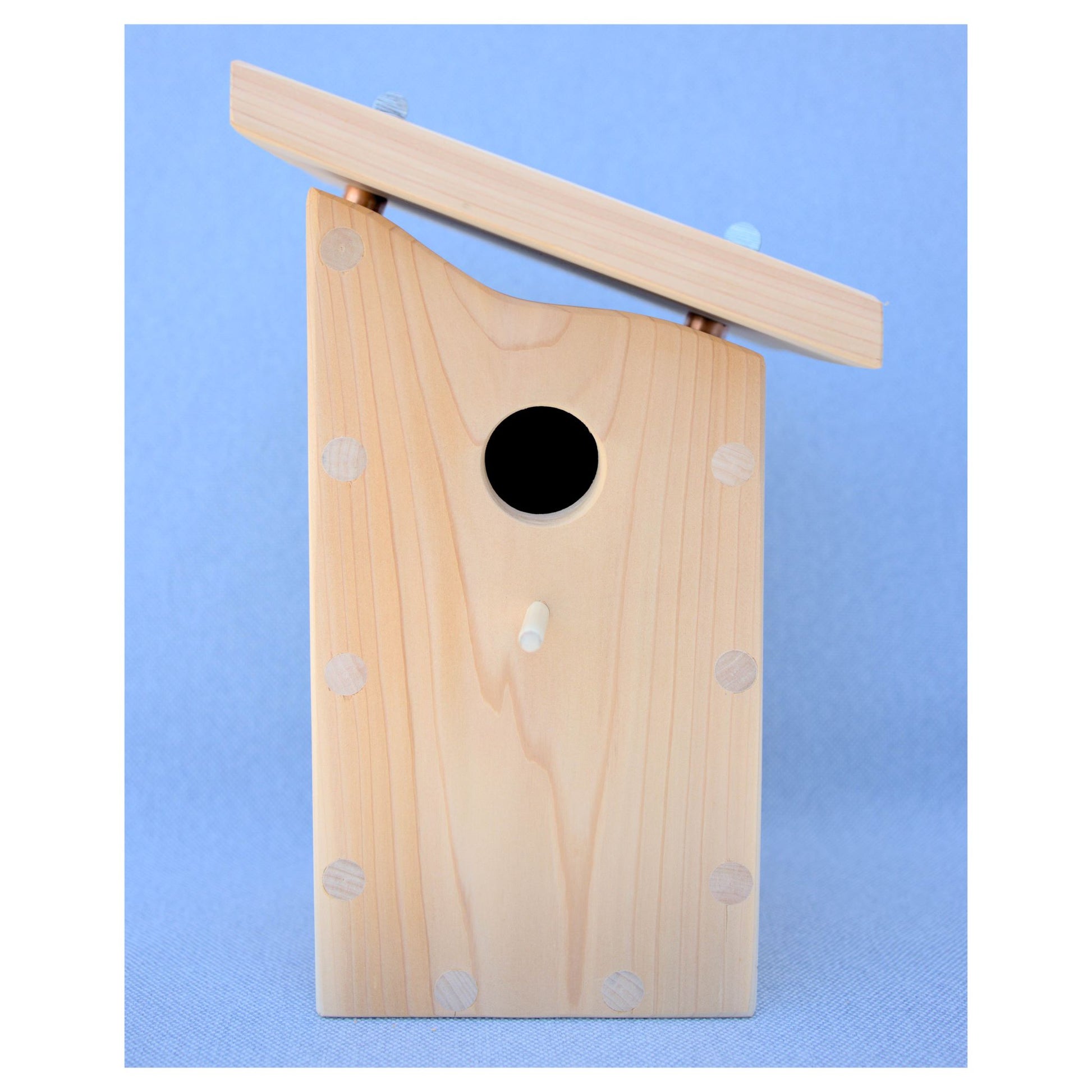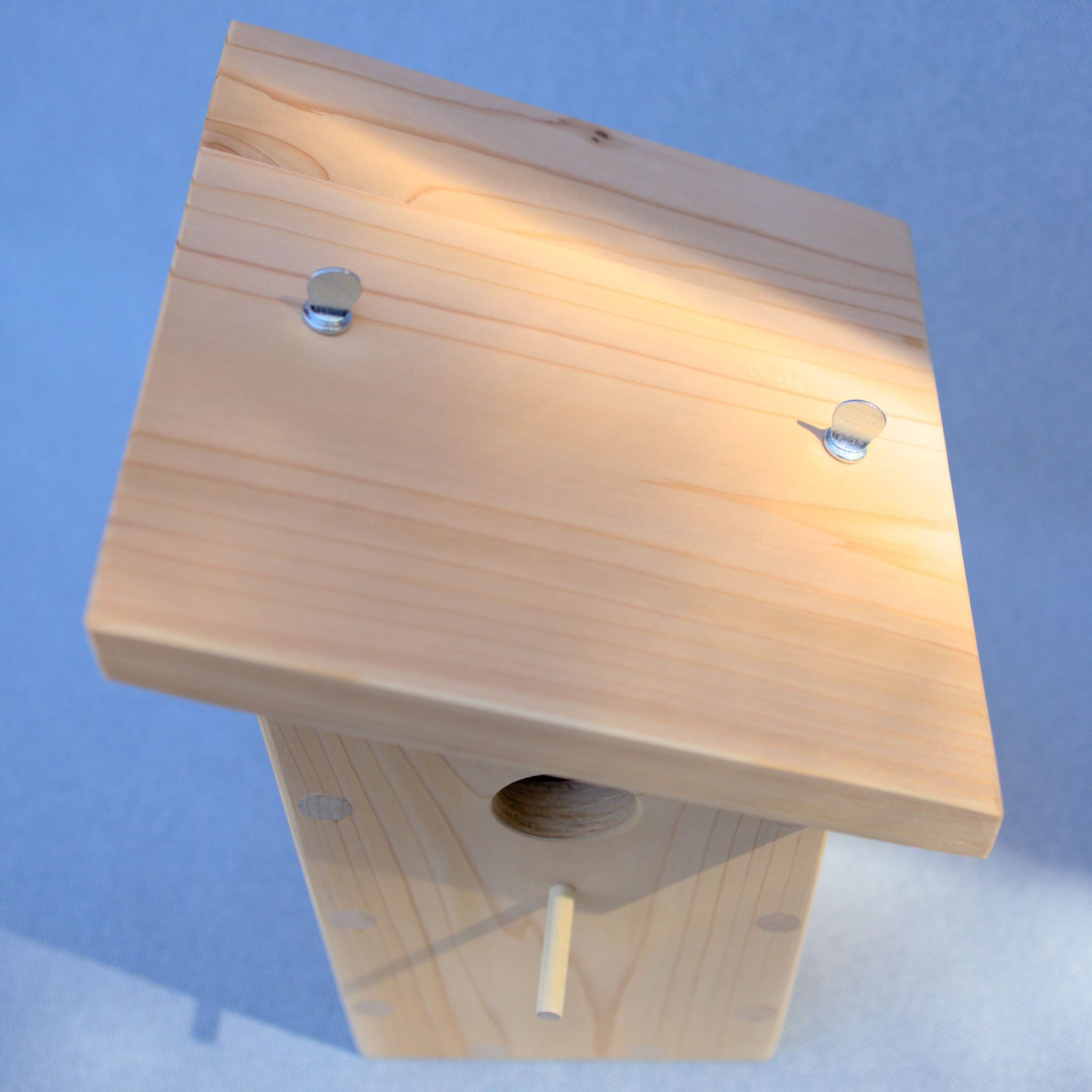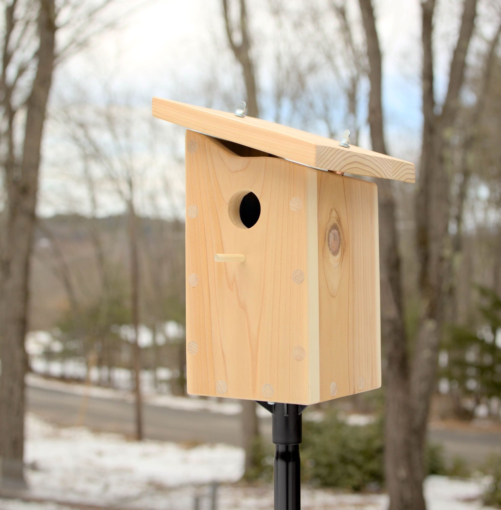 The Cedrus House is a delightfully simple and modern birdhouse design. The quality speaks for itself with clean slants, gentle curves and no exposed screw holes. It's made of unfinished cedar which is naturally rot and insect resistant. The roof is slightly elevated above the frame to allow for airflow. The overhang and slant help protect the birds against rain and wind.