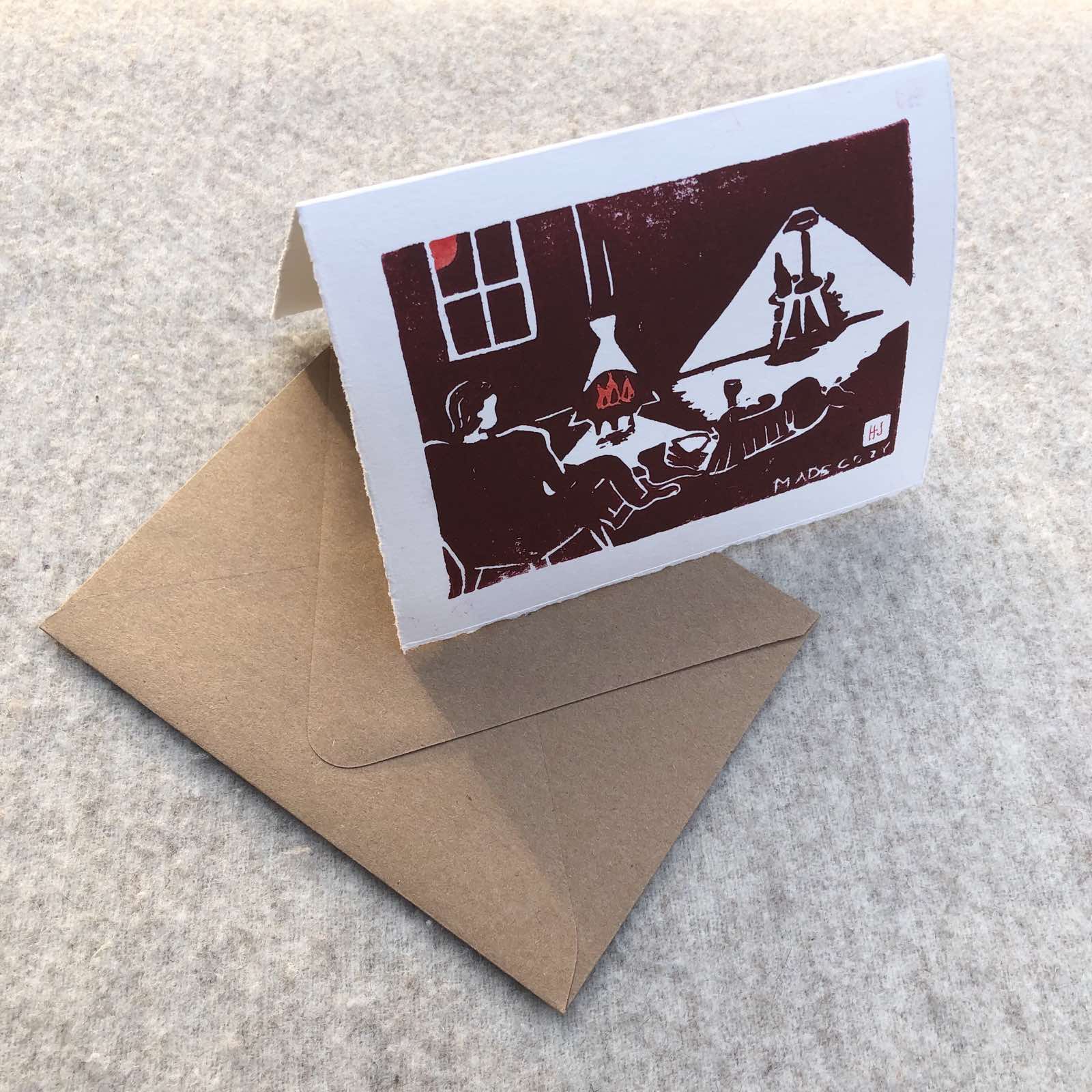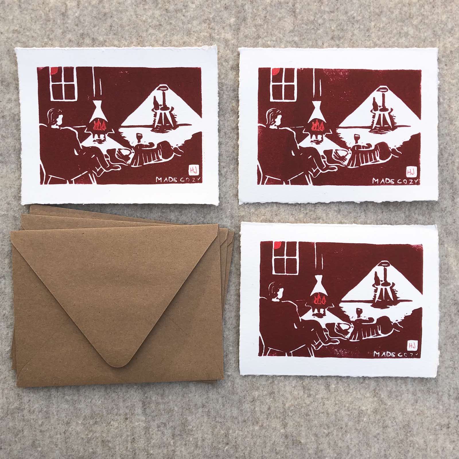 The imagery is of two people facing a fireplace inside a cozy living room at night. These are perfect to send as little prints to stand on their own of for Valentine's Day or Monther's/ Father's Day with a hand written note on the back.