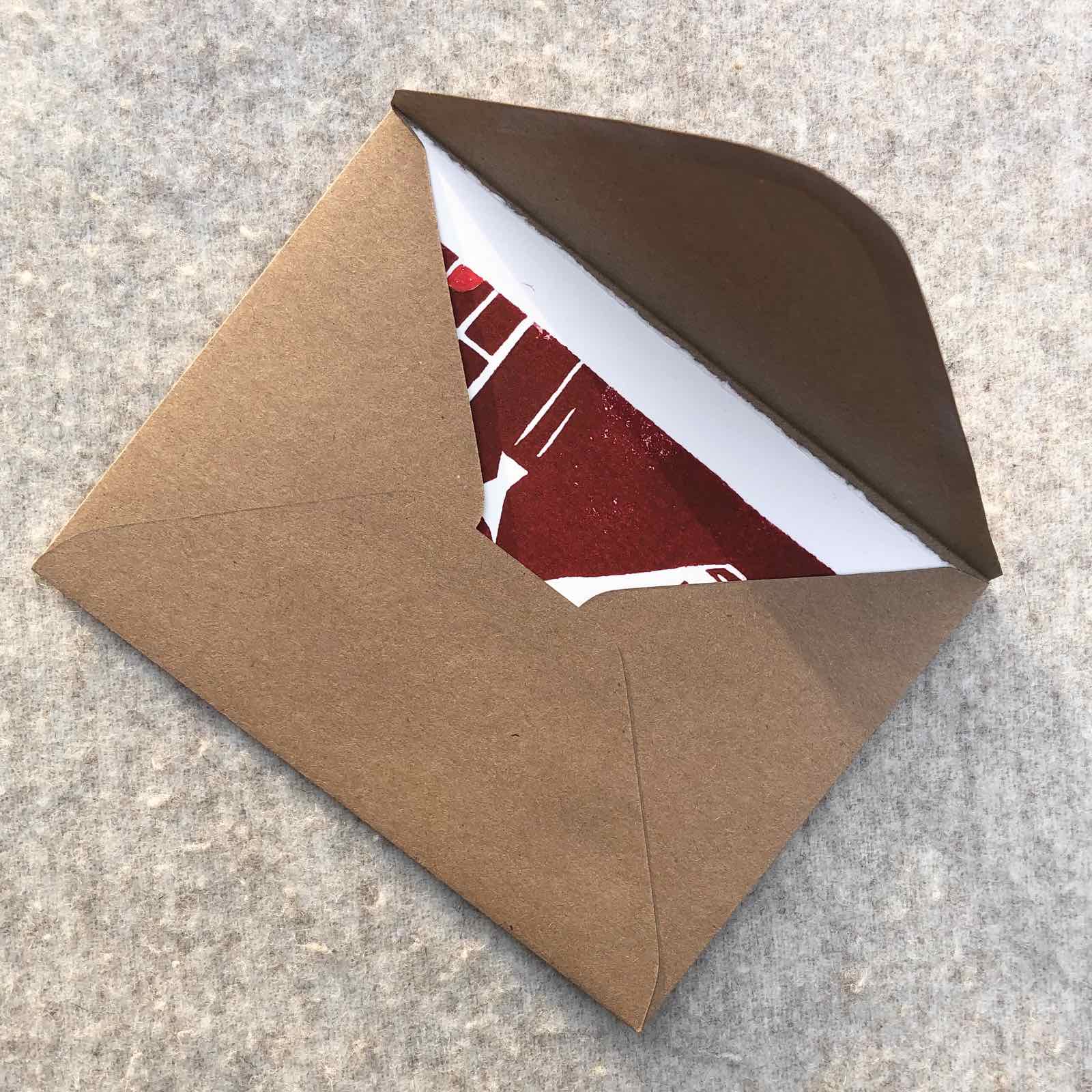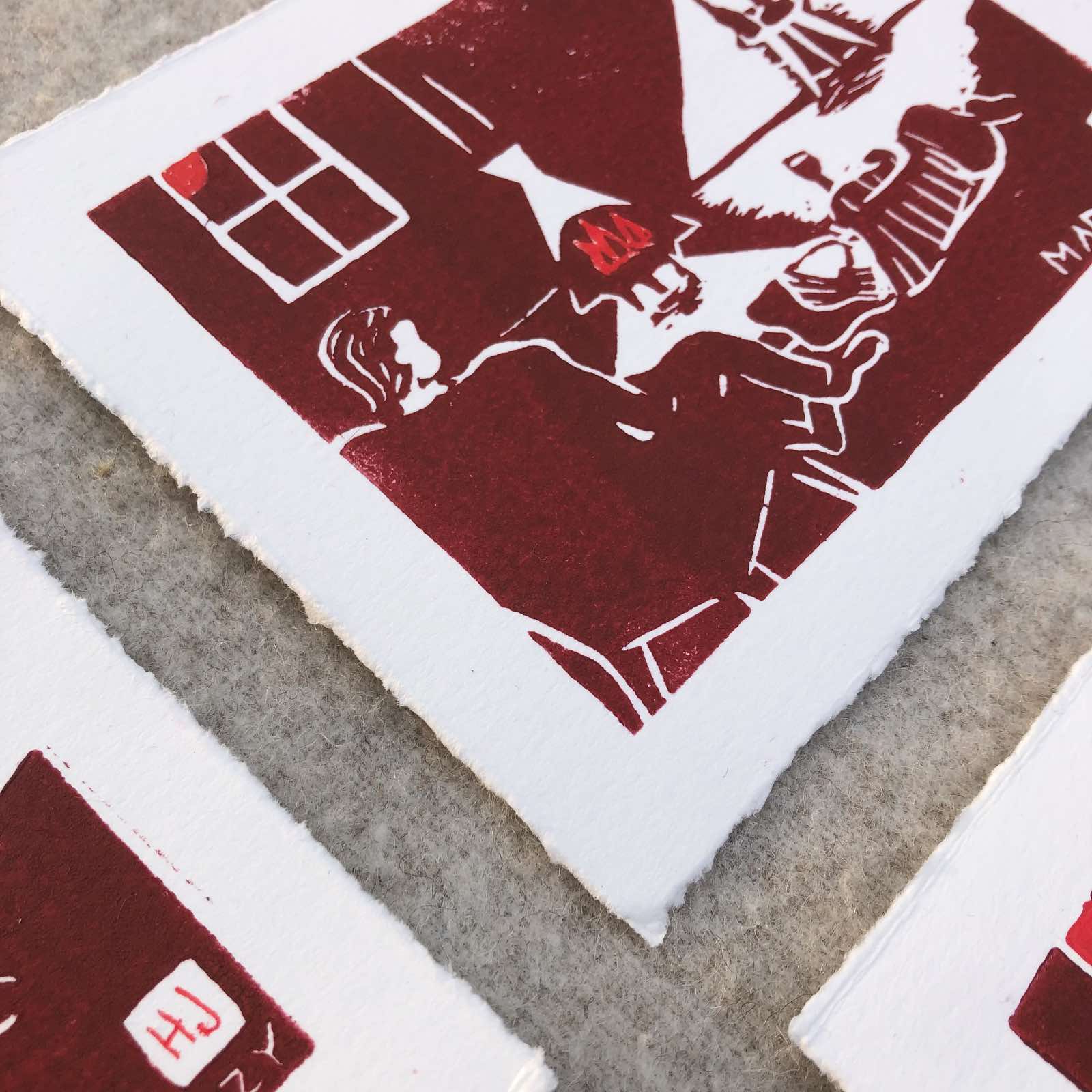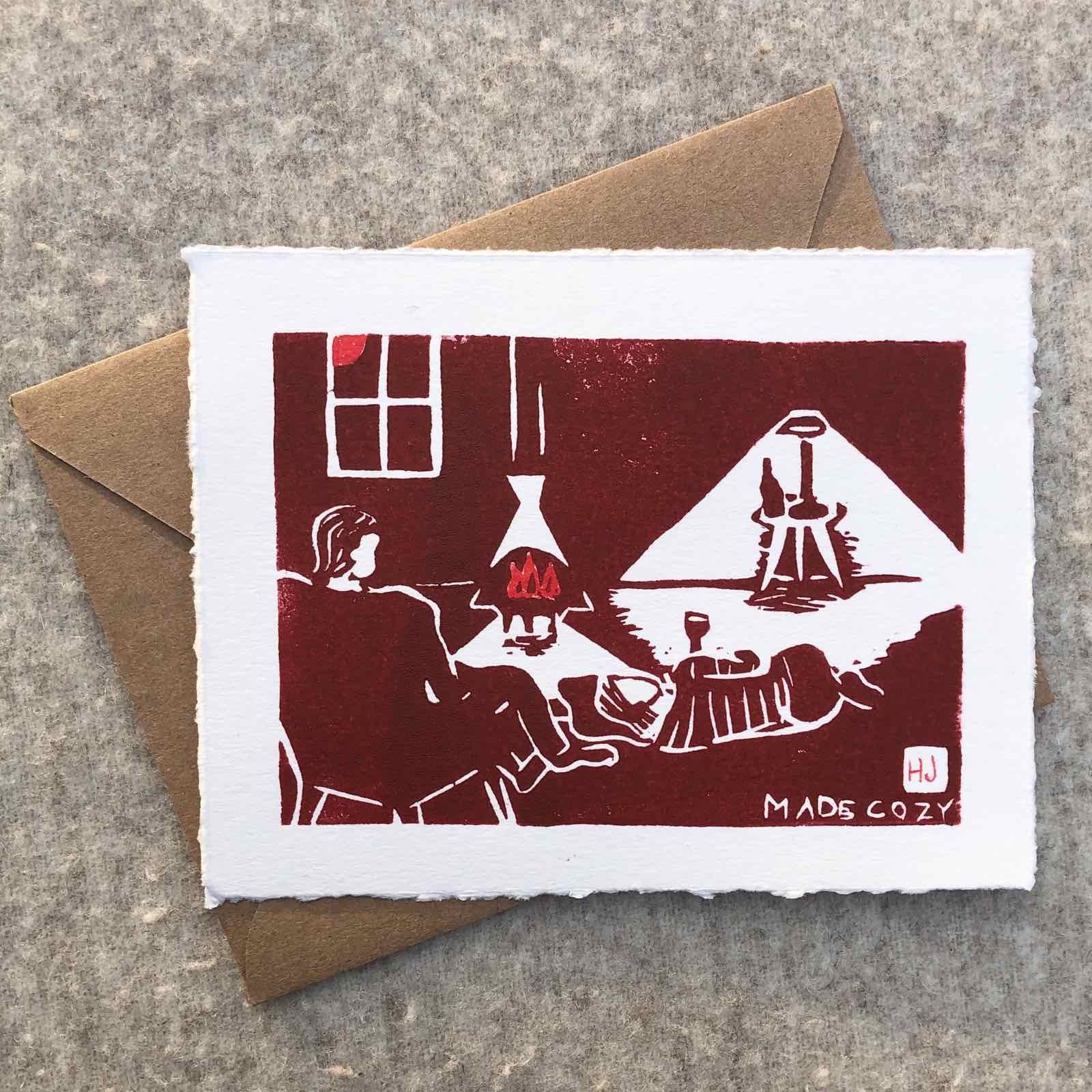 Say hello to greeting cards that double as little pieces of art. Mail one to the person you are so close to that you can enjoy doing nothing together. These cards are block printed by hand in our Massachusetts studio. They have watercolored embellishments and are signed by the artist. They are printed on archival cardstock with a deckled edge and come with a recycled kraft euro-flap envelope. The print and envelope come to you packaged in a rigid mailer to keep it safe.