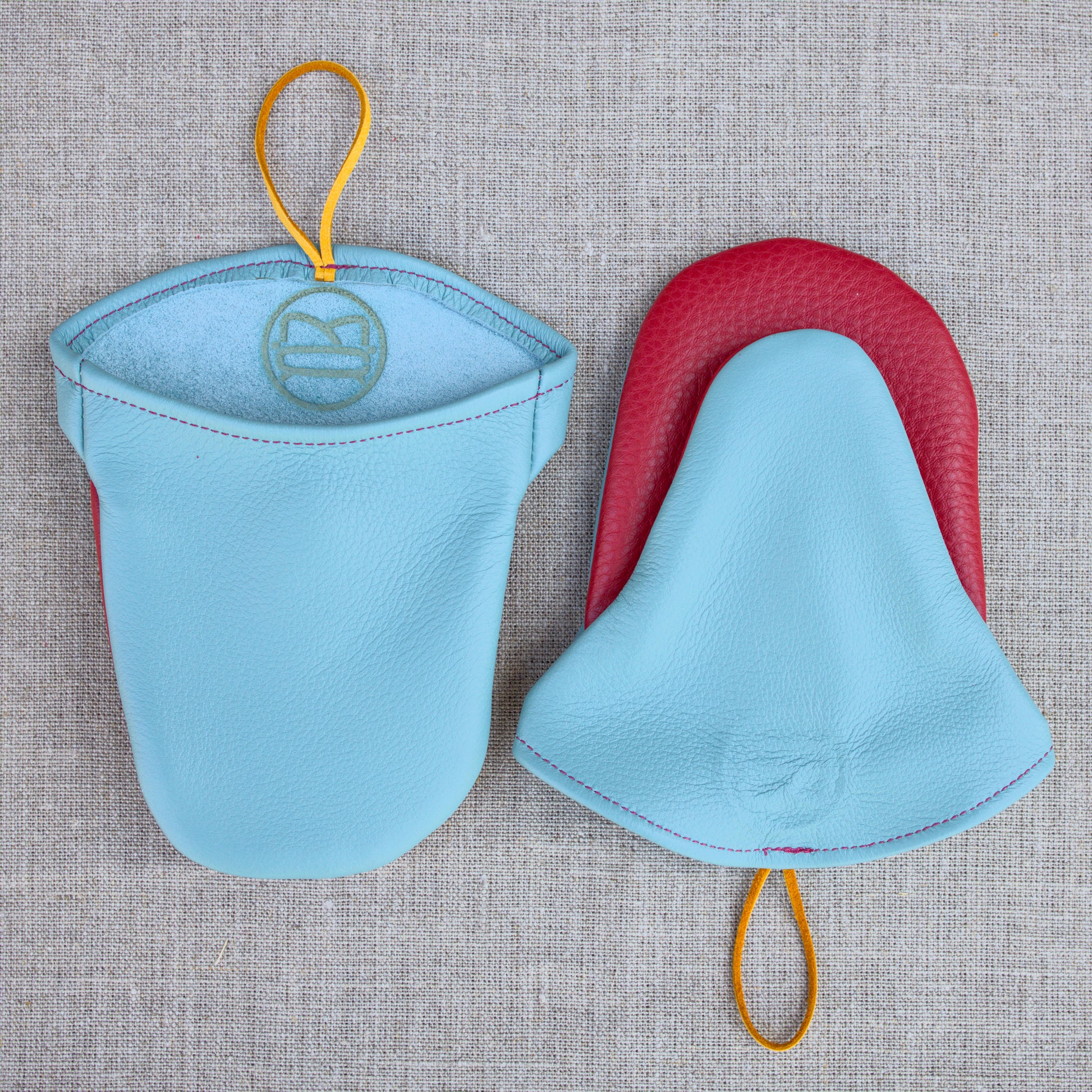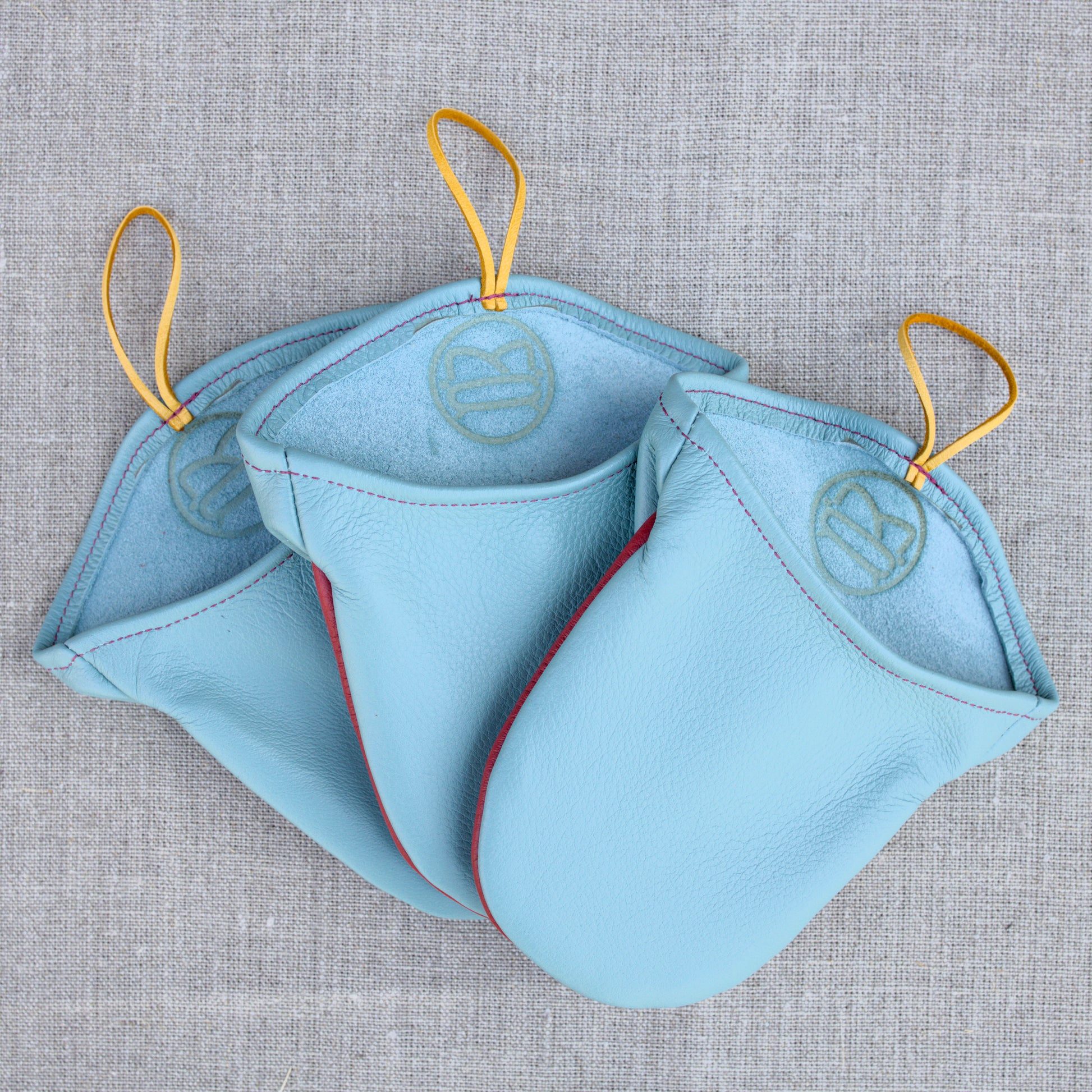 A hybrid between potholders and oven mitts these Half Oven Mitts are made to be quick to slip on when you need to handle hot objects in the kitchen. The leather on the inside is thick enough to protect your hands from heat but flexible enough to allow for dexterity. The outer leather is soft and supple. Leather will naturally take on oils with use and will wear beautifully. Sold individually.
