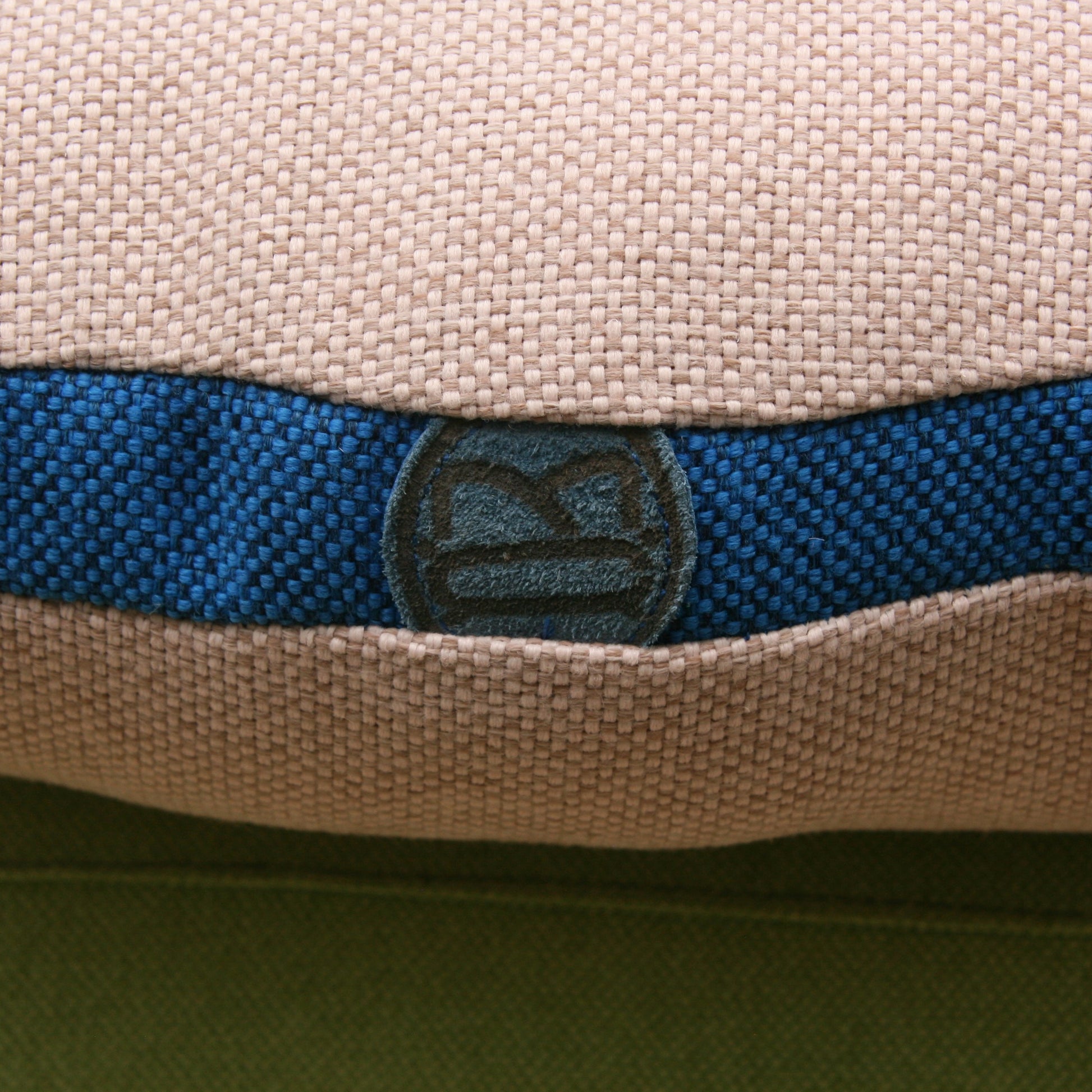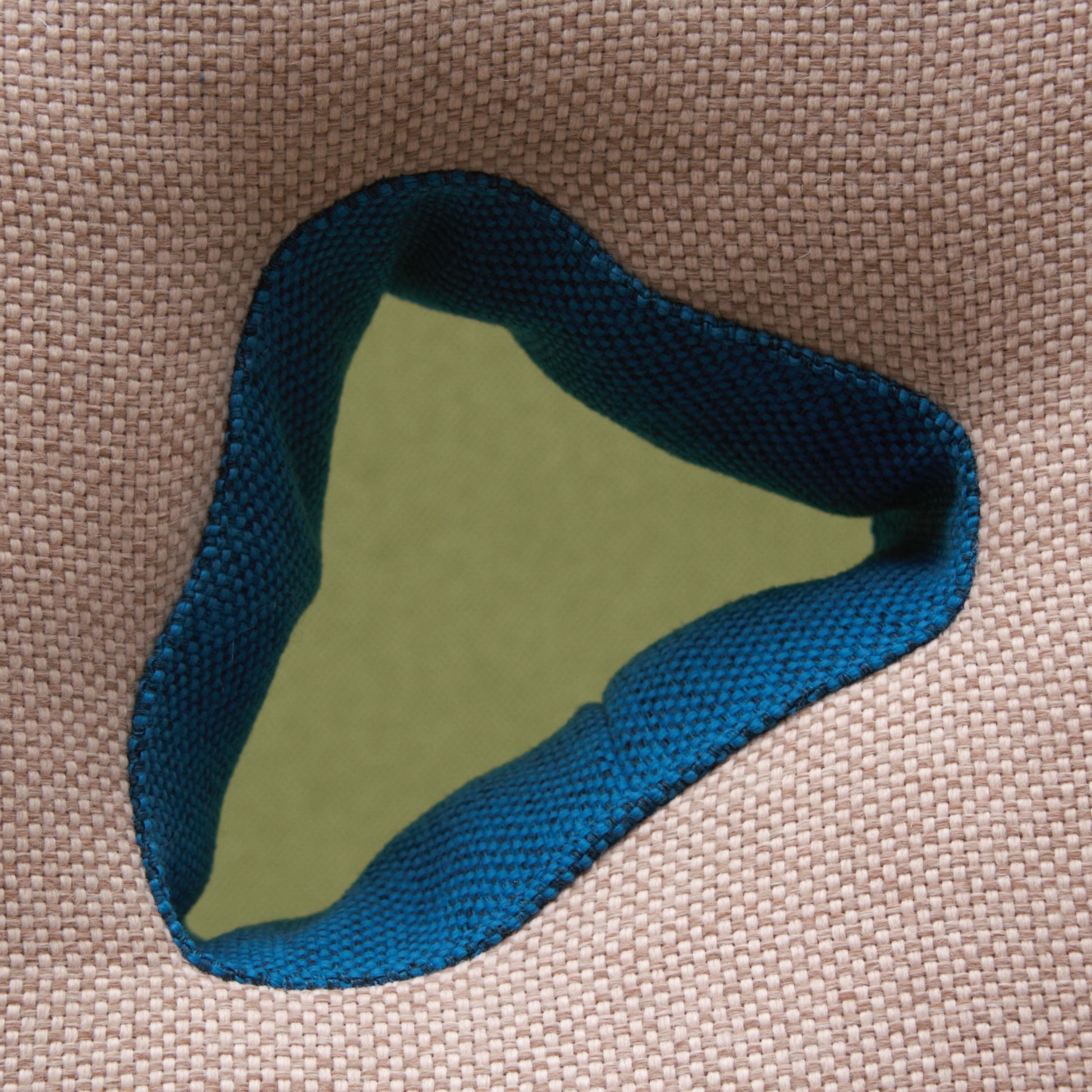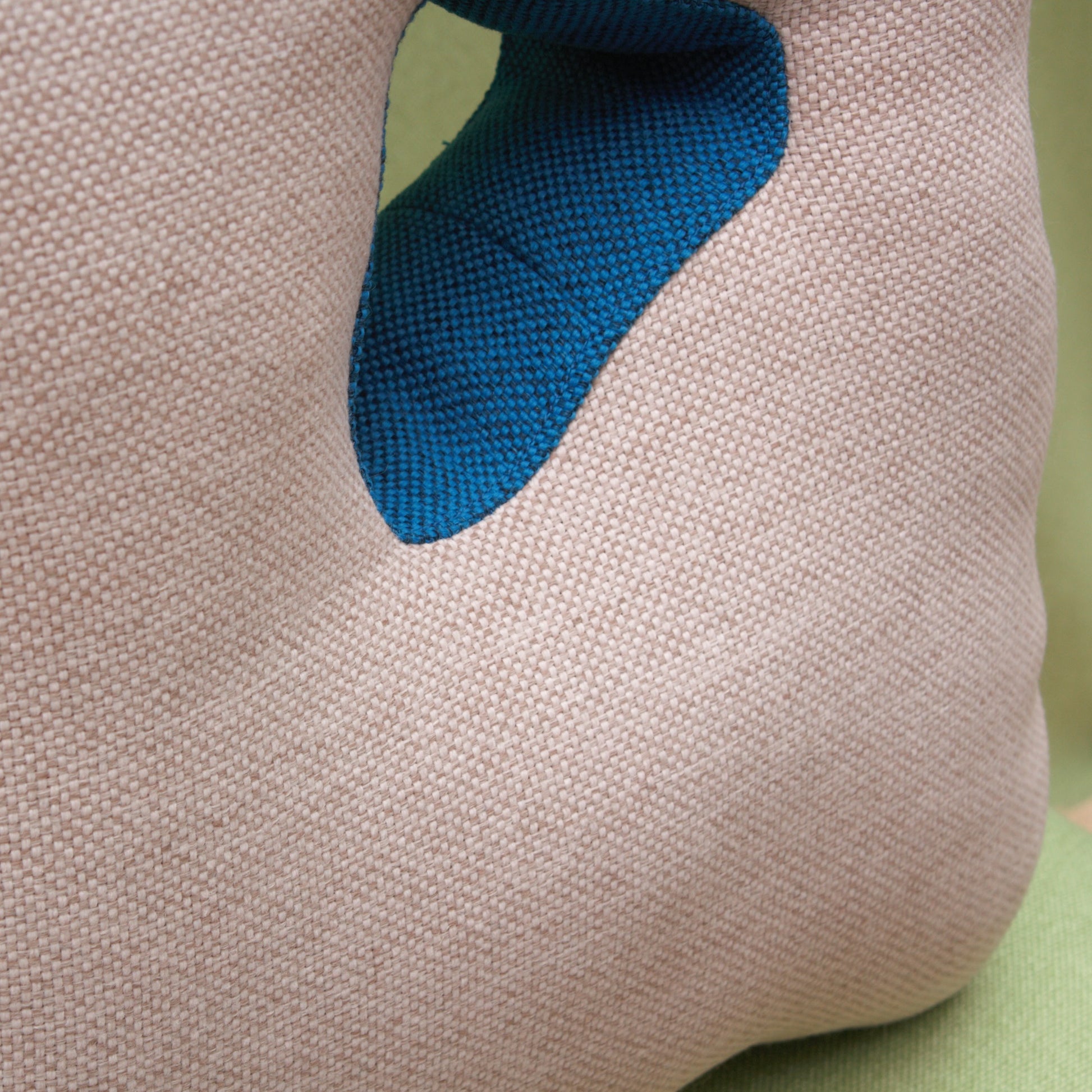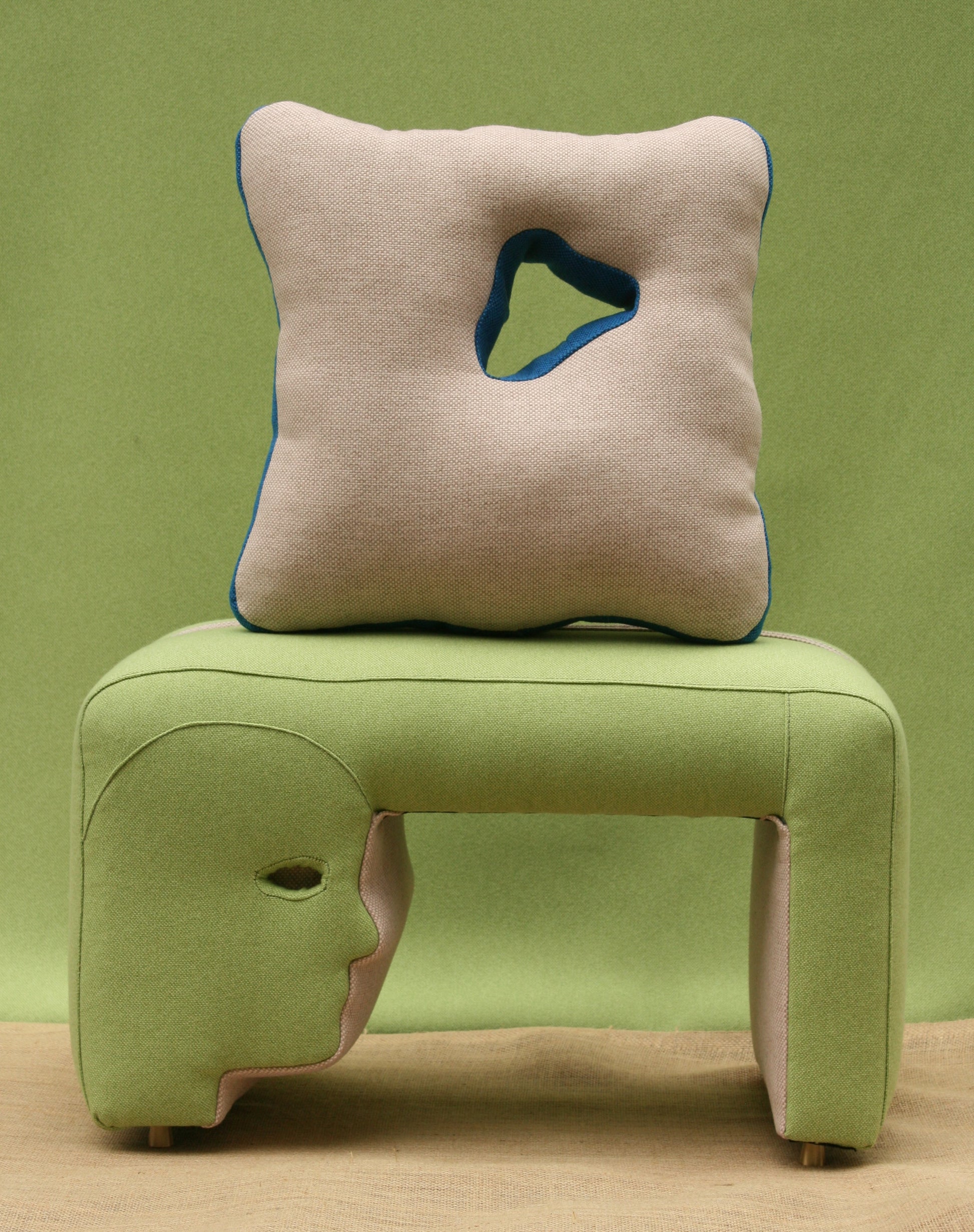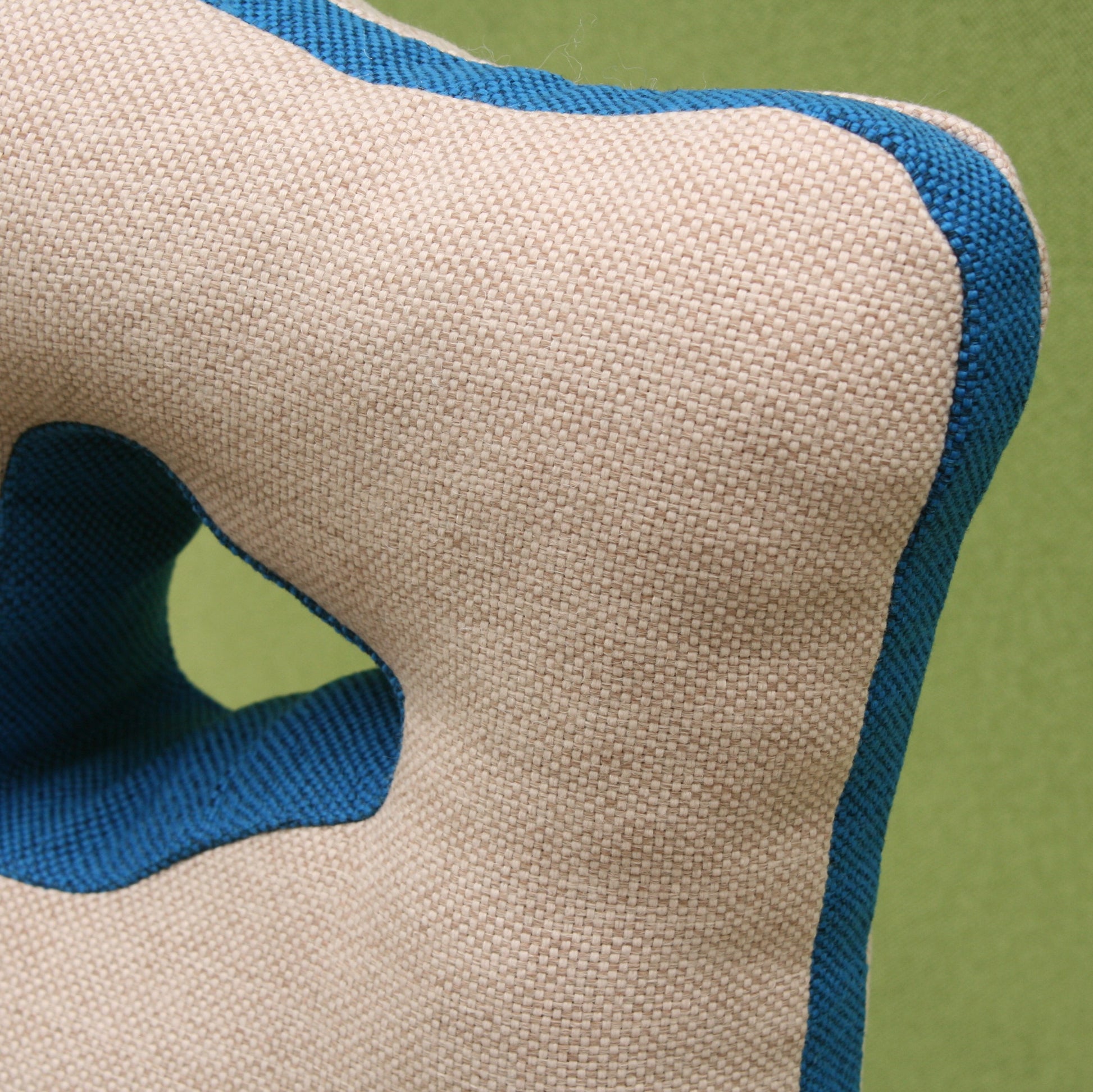 This pillow has a hole in it! The Holes pillow is a part of our collection titled Contour Objects. The green variant is sewn with a thick woven green fabric with a 1” grey border. The organic shaped hole is made of a yellow wool. The pink variant is a greyish petal pink with a cobalt blue boarder and hole. Holes allows us to think about and explore how we use pillows. Sometimes it is nice to lay sideways on a pillow and not crush your ear. Other times we like to hug pillows and hold them close and by sticking your arm through the hole, this pillow hugs you back.