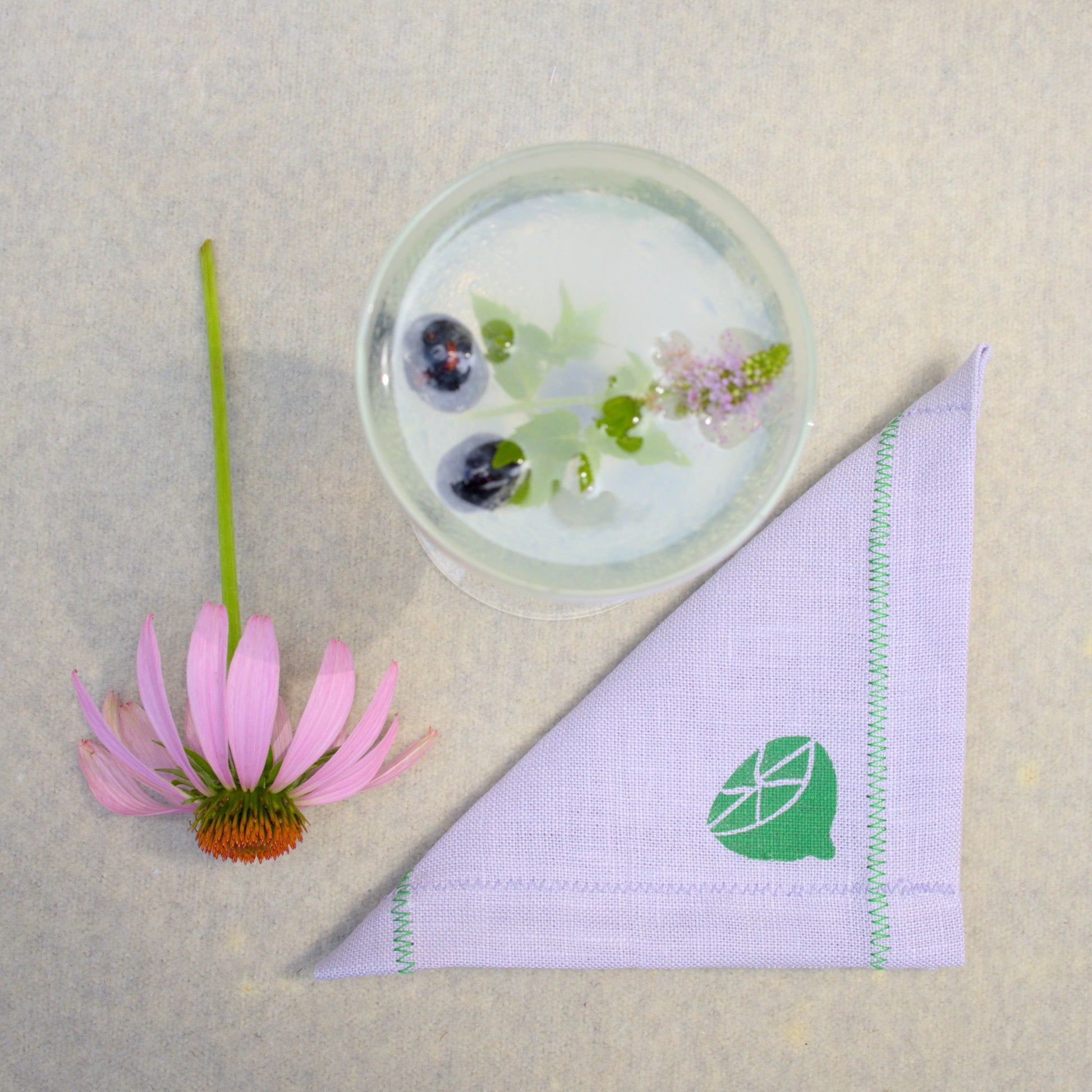 Here’s an excuse to throw a cocktail party! These elegant yet playful napkins are the perfect addition to your bar cart. They are sewn out of 100% linen in a soft lilac color complete with lime-green stitching and a small but bold block print.