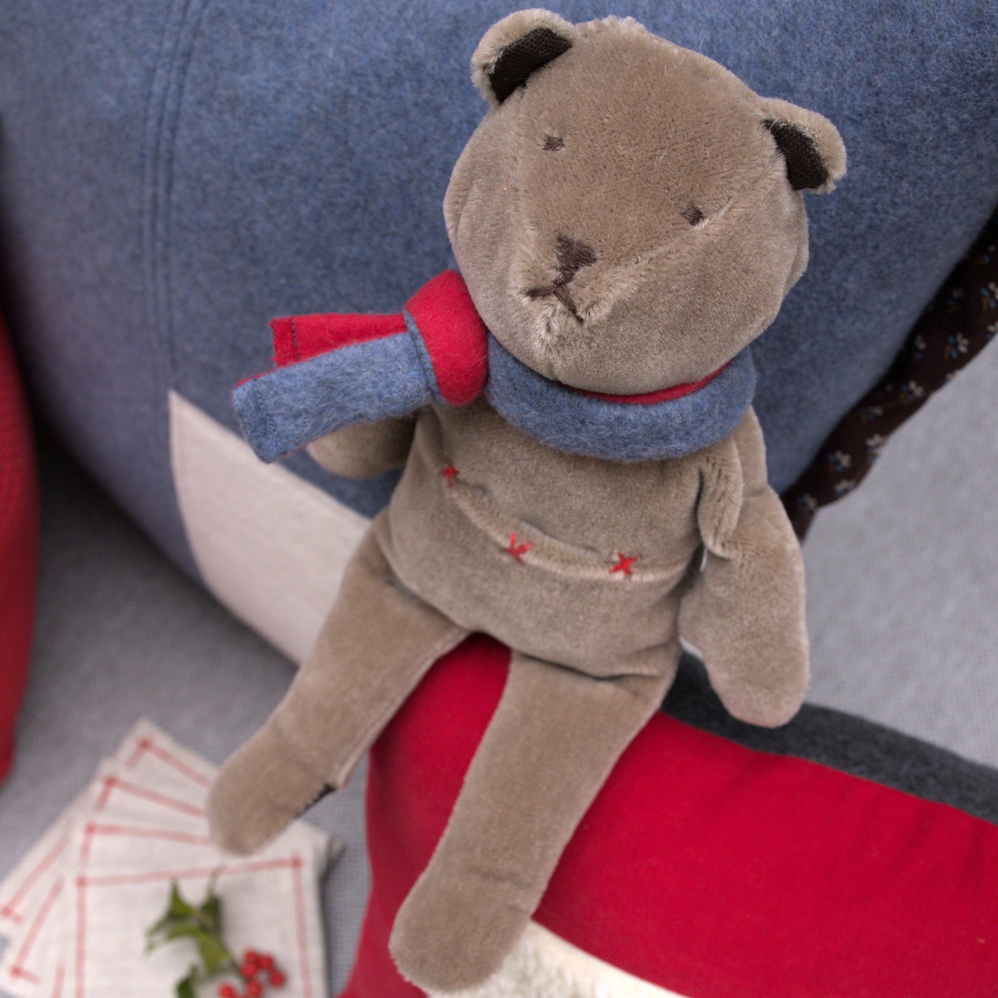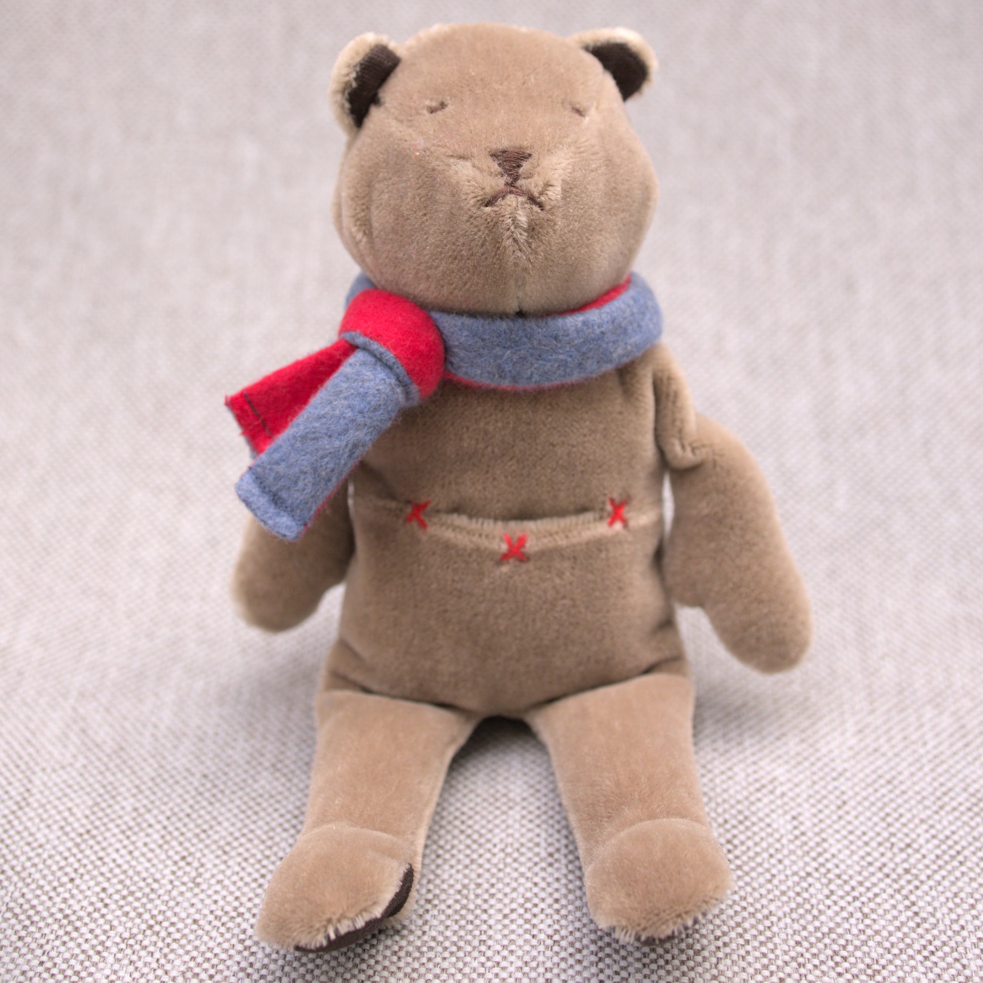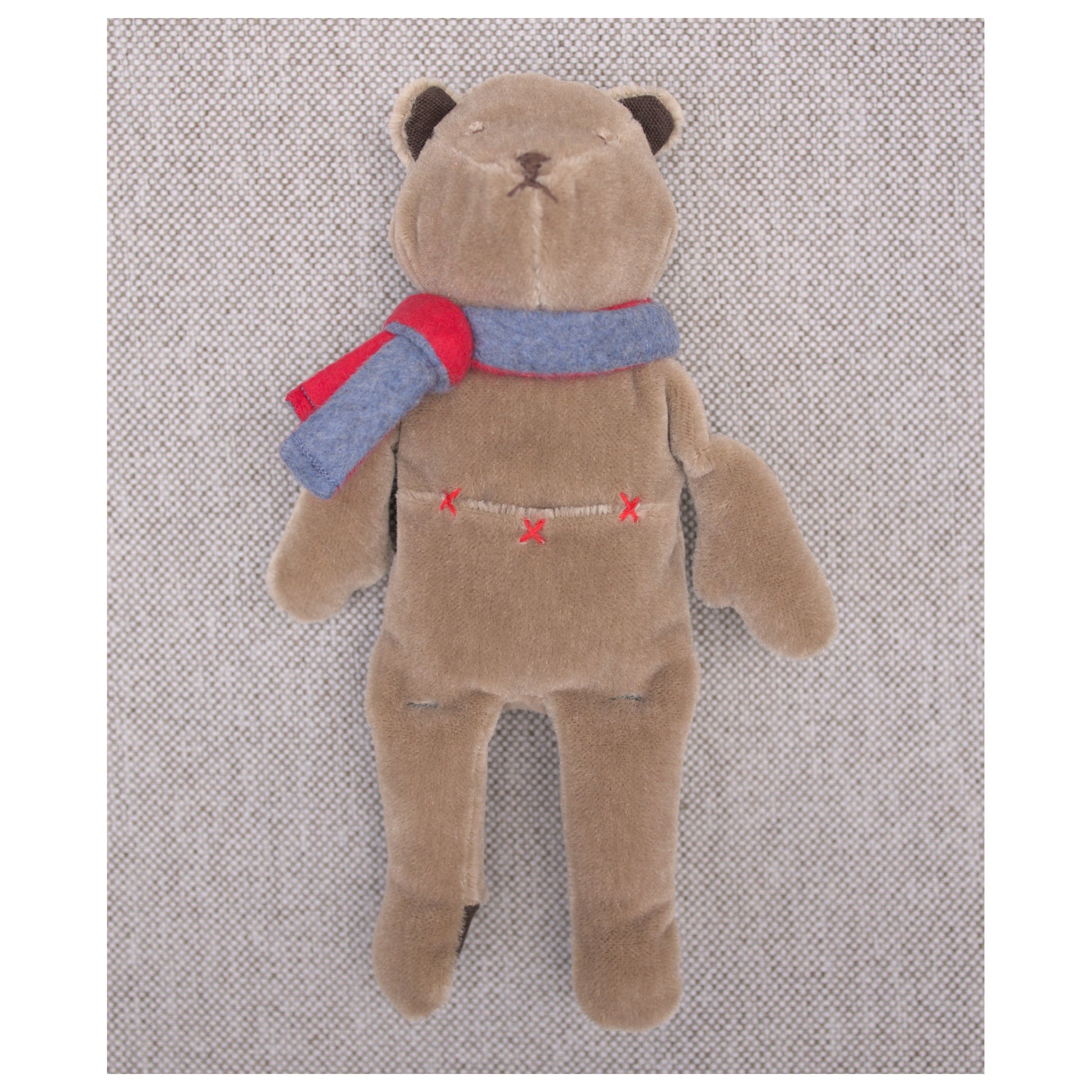 A limited edition teddy bear made from traditional mohair with a small built in pocket to hold your treasures. As with all of our toy designs, we find inspiration in traditional designs and materials but add a modern detail like the three red X 's across the pocket. The shape and proportions were inspired by Oliver's favorite floppy teddy bear from early childhood. In this bear we chose to design a very structured head and face, and simpler body. These mohair bears are stuffed with wool and will soften and age beautifully with your child. The Pocket Bear also has hand embroidered details, a 100% cotton fleece scarf, and is hand sewn closed.