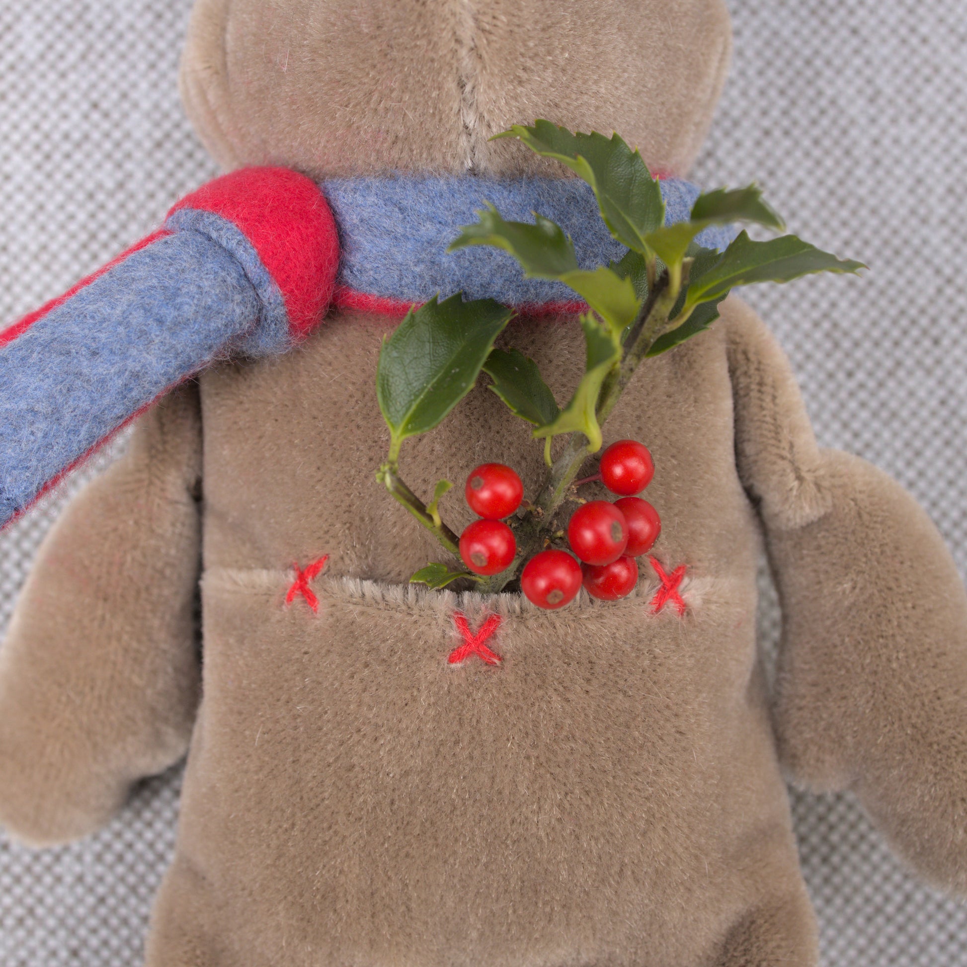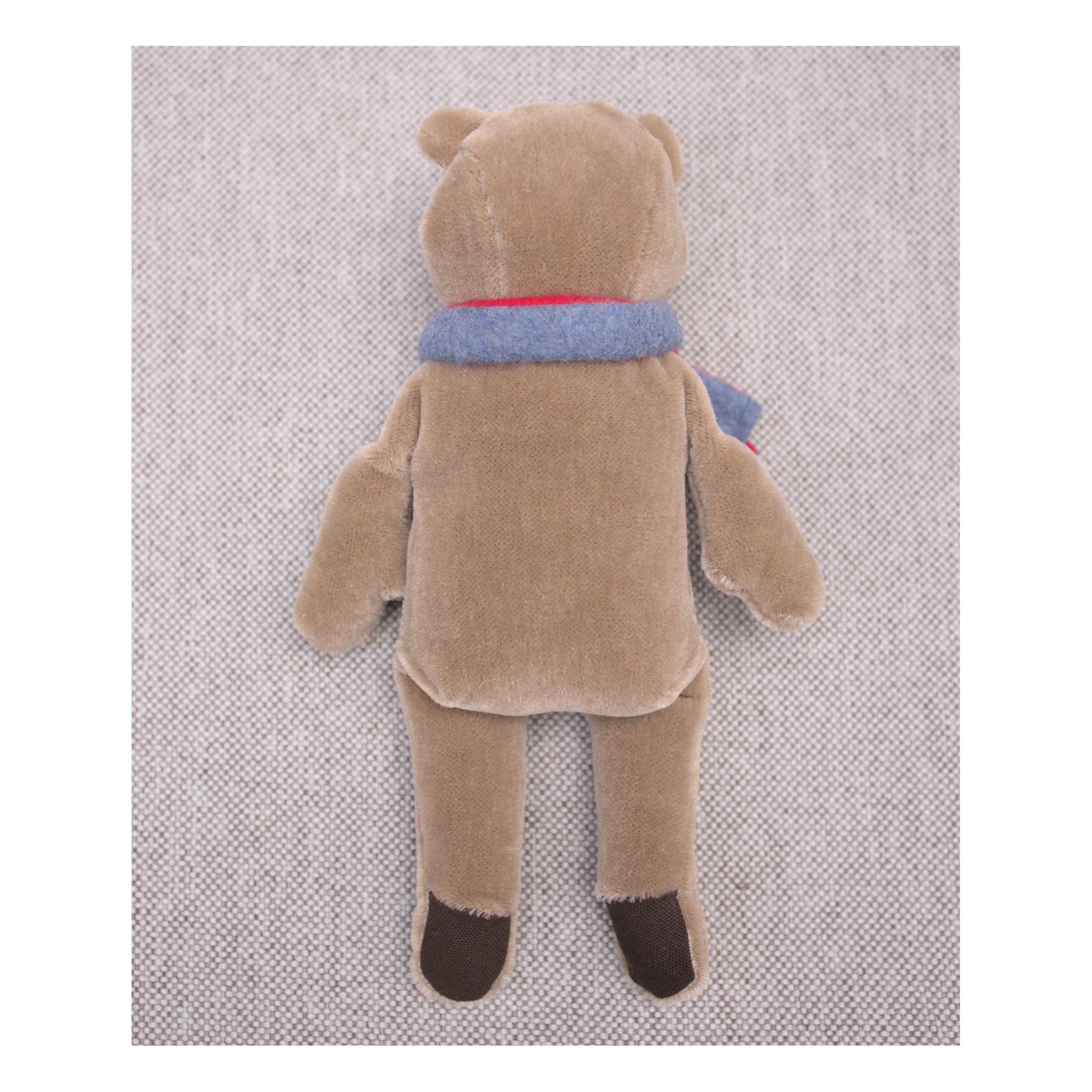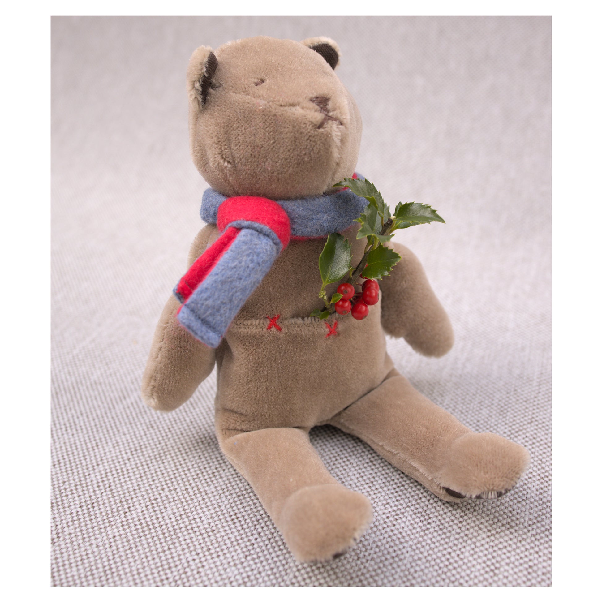 A limited edition teddy bear made from traditional mohair with a small built in pocket to hold your treasures. As with all of our toy designs, we find inspiration in traditional designs and materials but add a modern detail like the three red X 's across the pocket. The shape and proportions were inspired by Oliver's favorite floppy teddy bear from early childhood. In this bear we chose to design a very structured head and face, and simpler body. These mohair bears are stuffed with wool and will soften and age beautifully with your child. The Pocket Bear also has hand embroidered details, a 100% cotton fleece scarf, and is hand sewn closed.