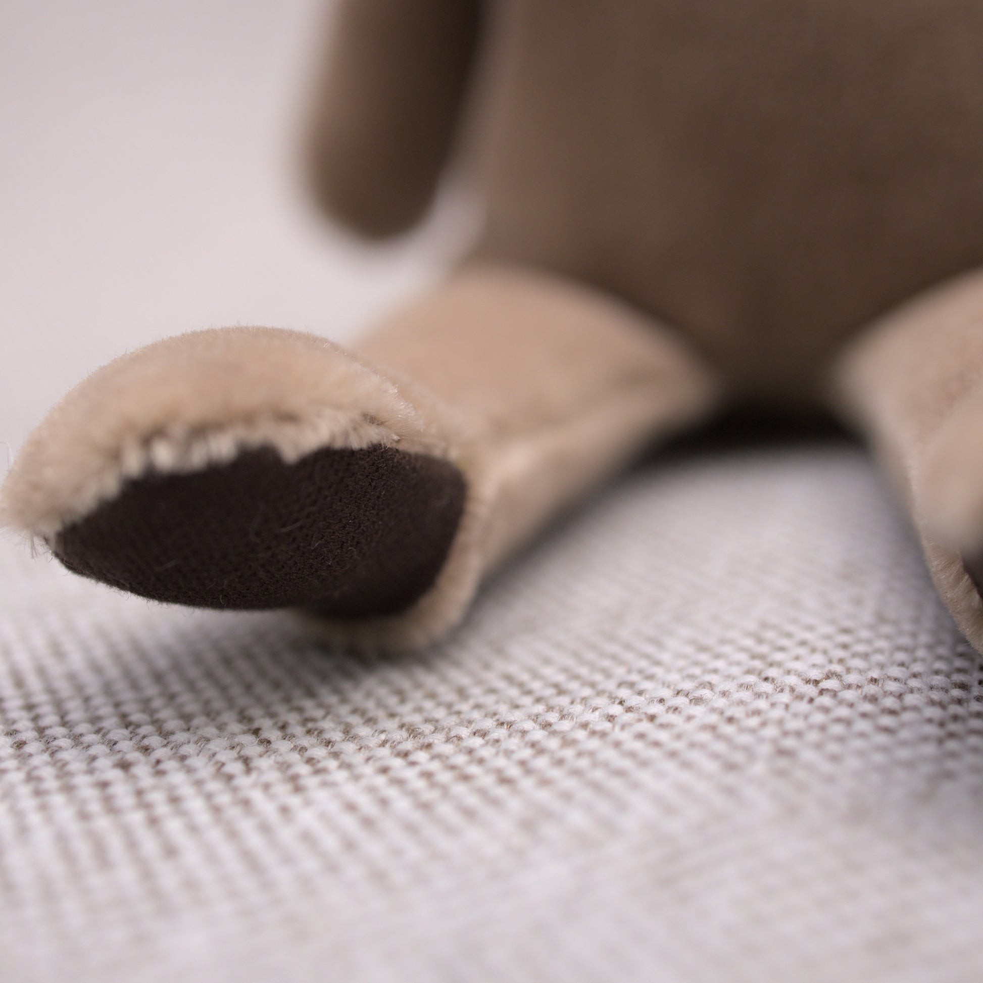 We use 100% wool mohair fabric with cotton backings. This means the pile is made of wool and the woven fabric it is attached to is cotton. We tend to purchase our mohair fabrics as "remnants." This means it was designated as an offcut-- the last piece of fabric on the bolt. Sometimes the fabric isn't made anymore, other times it is just an strange size that can only be used for small pieces like toymaking. Not only are these fabrics all natural, but using them is a great way to reduce waste as they are harder to sell.
