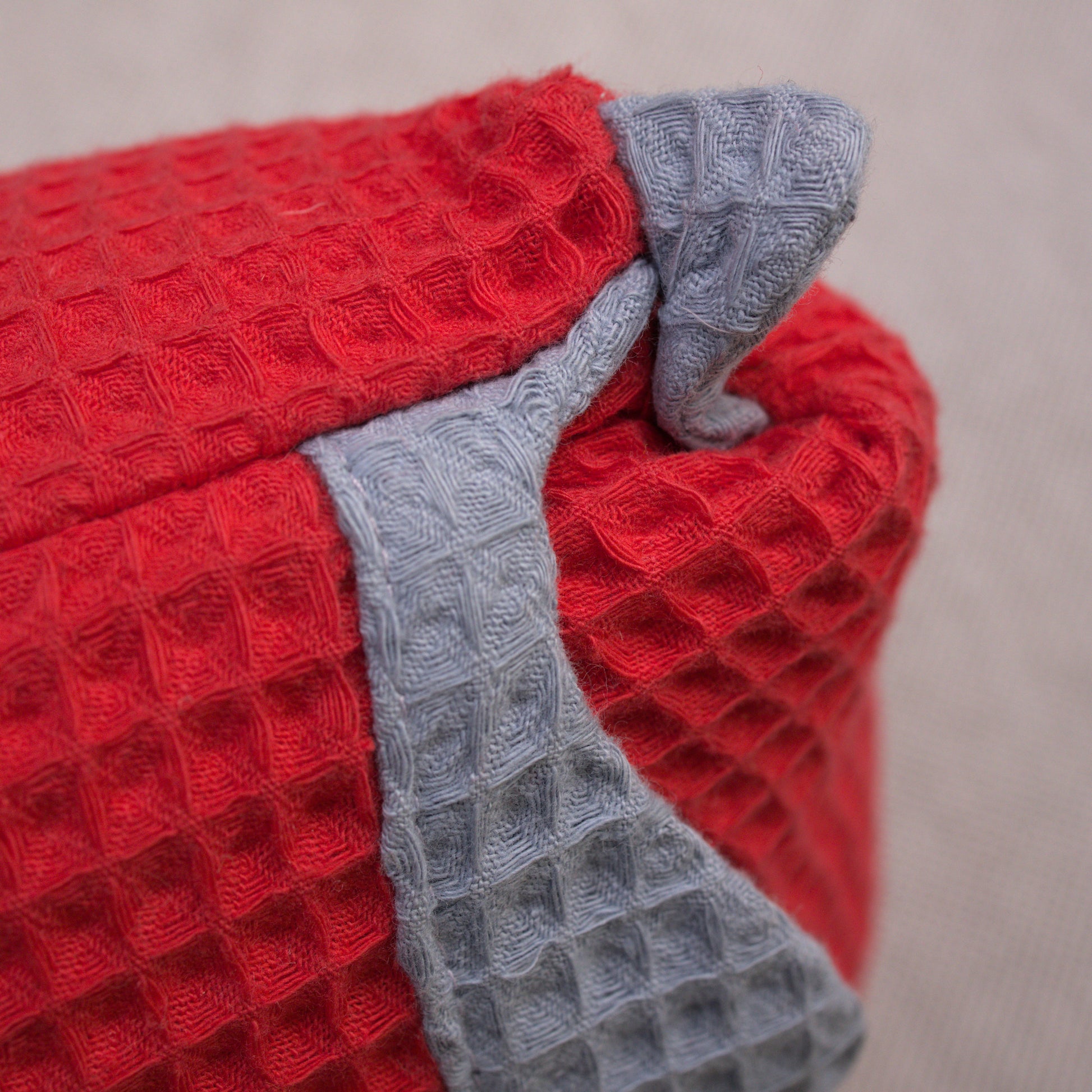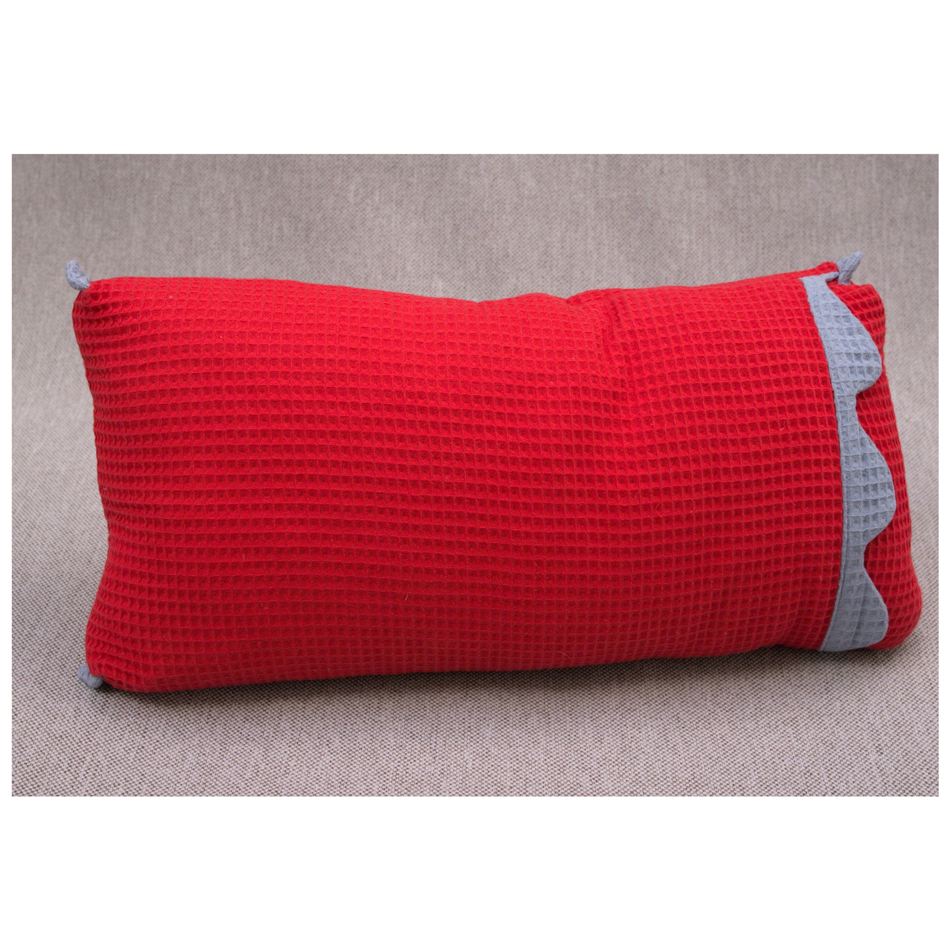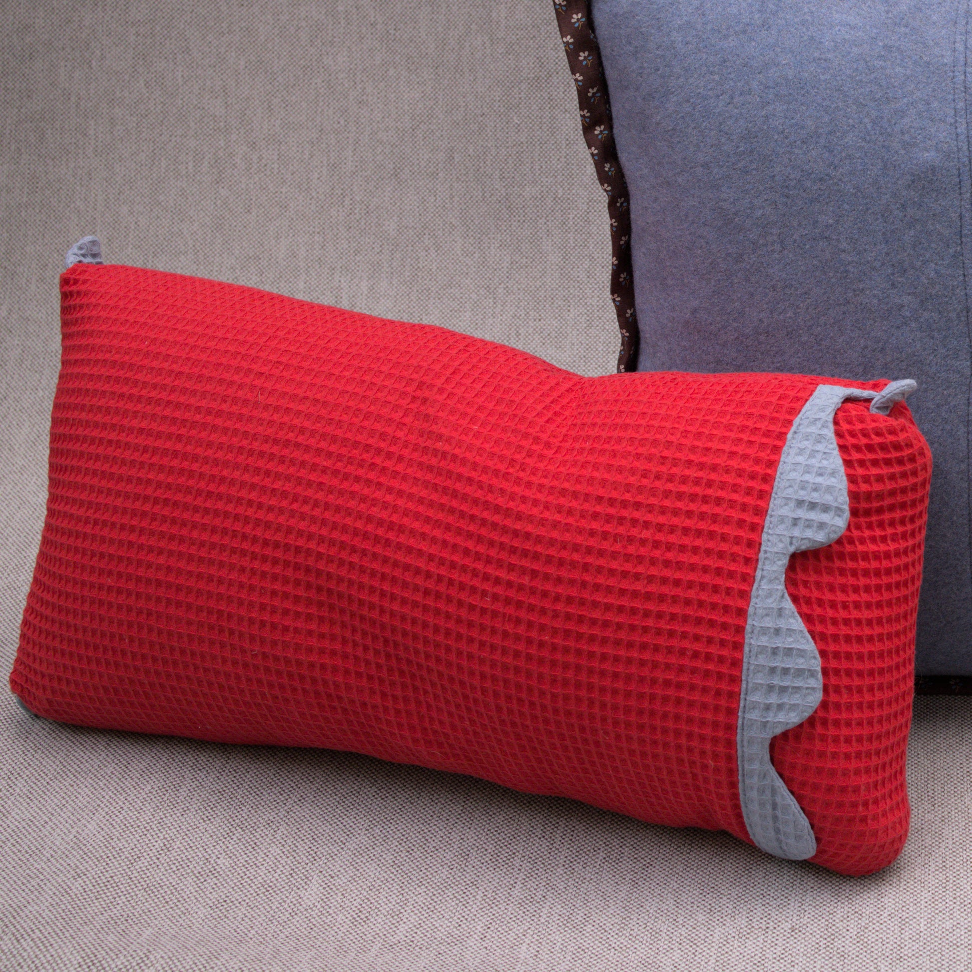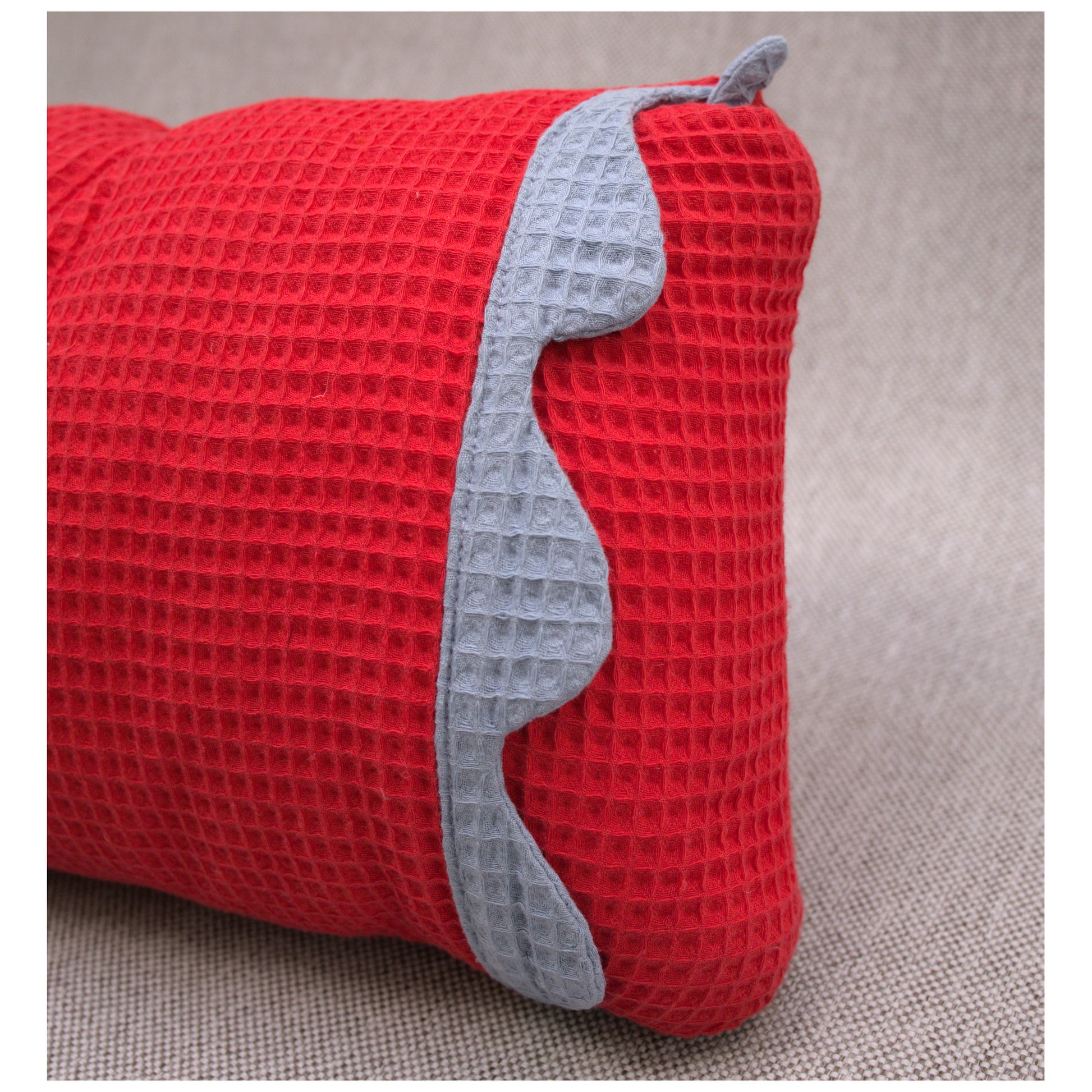 A throw pillow in woven waffle fabric made from 100% cotton. These pillows are sewn with French seams, and a pocket enclosure with a detailed edging inspired by waves. This detail is repeated in each corner with a stormy ocean blue fabric. The main fabric is a bright cardinal red. This pillow warms up a wintery livingroom with an unexpected red accent. These come with down and feather pillow inserts.